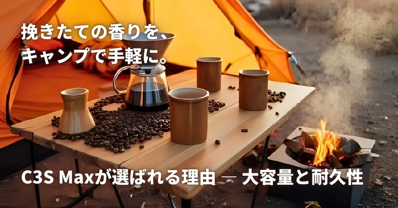 自然の中で飲む一杯のコーヒーは格別です。でも「挽きたてを用意したいのに味が落ちる」「2人分は何度も挽かなければならない」「荷物は増やしたくない」と感じていませんか?TIMEMORE C3S Maxは、大容量30g・S2C 660 Burrs搭載・折りたたみハンドルという特徴で、キャンプの朝の悩みをまとめて解決します。本記事では、C3S Maxがアウトドアで選ばれる理由を具体的に、実践的なコツと併せて解説します。